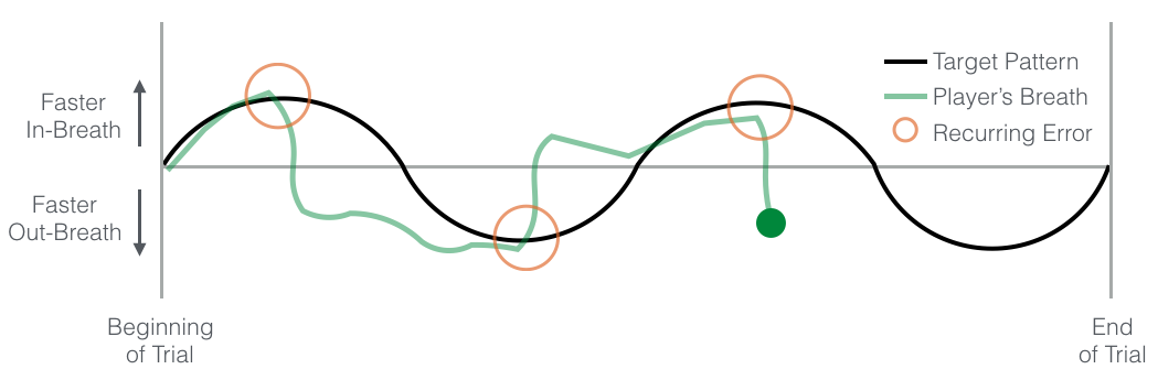 We noticed a recurring error among beginning players. At the top and bottom part of the curve, players would try to follow the curve by changing the direction of their breath, from in to out or from out to in. This was an error not of breath control but of reading the representation. The intuition is natural: the line is changing direction, so my breathing should too. But in this case it's wrong. The upper and lower extremes of the graph represent the fastest in and out flow rates. To bend the line back toward the middle, all you have to do is keep breathing in the same direction, but more gently.